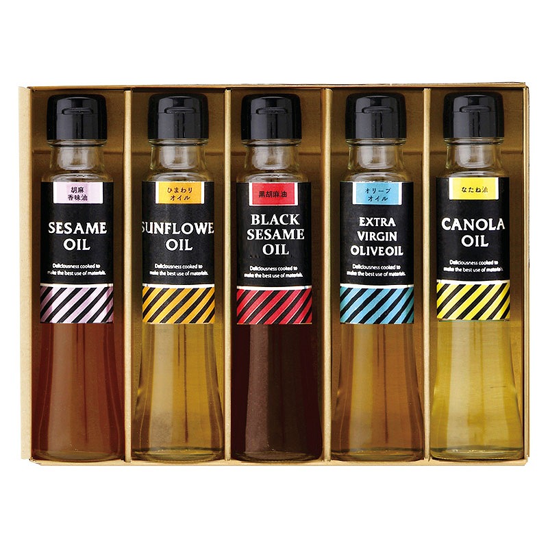 セット内容/胡麻香味油・ひまわり油・黒胡麻油・EXVオリーブオイル・なたね油(各90g)×各1