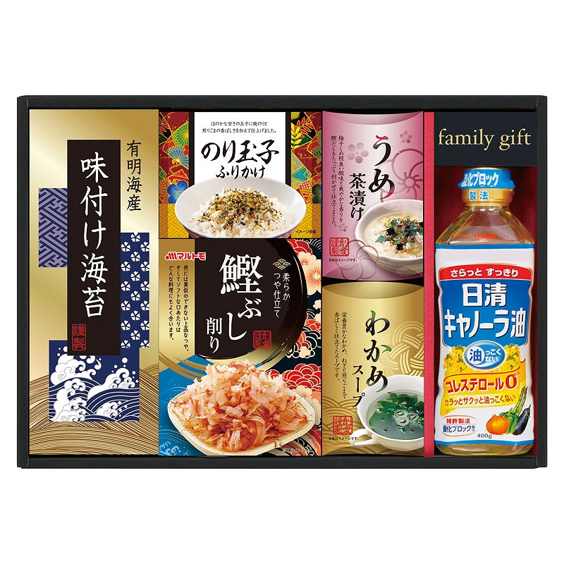 セット内容/有明海産味付け海苔(3切4枚)・のり玉子ふりかけ(4.5g×2袋)・鰹節削り(2g×4袋)・うめ茶漬け(4.3g×2袋)・わかめスープ(5.3g×2袋)・日清キャノーラ油400g×各1