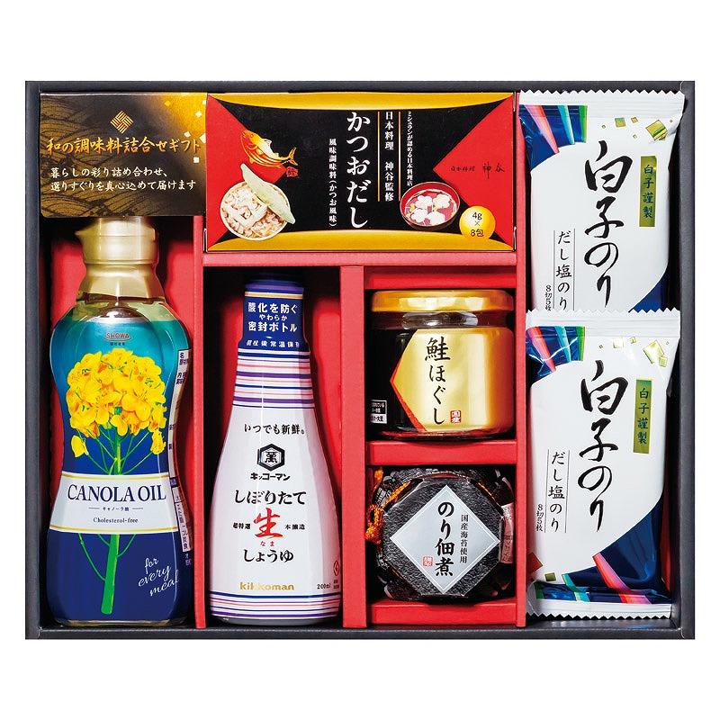 セット内容/白子だし塩のり(8切5枚)×2、鮭ほぐし(50g)・のり佃煮(80g)・かつおだし(4g×8袋)・キッコーマン しぼりたて生?油(200ml)・昭和 キャノーラ油(300g)×各1