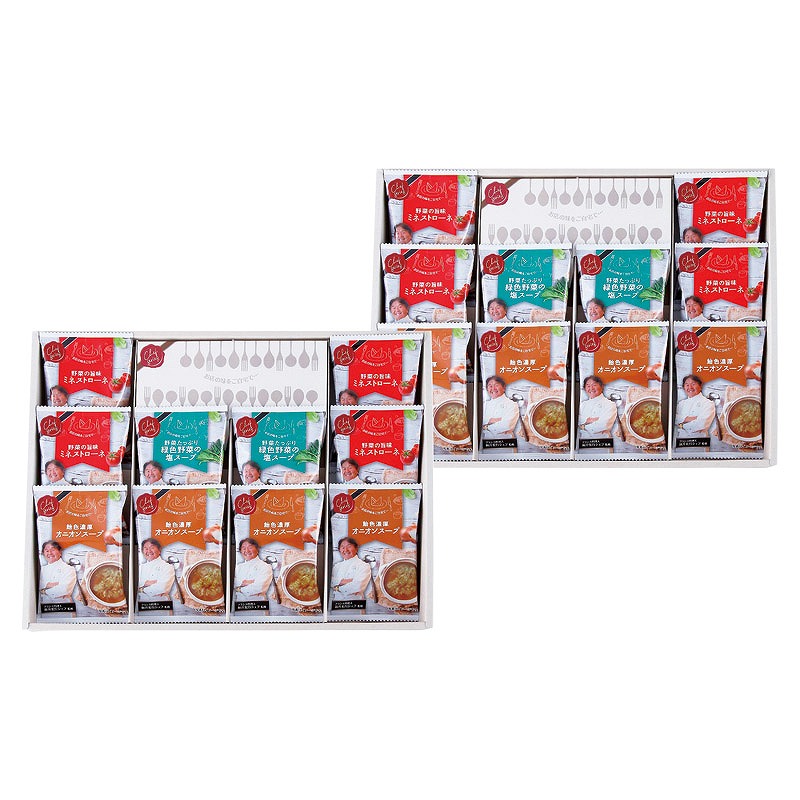 セット内容/オニオンスープ・ミネストローネ×各8、緑色野菜の塩スープ×4