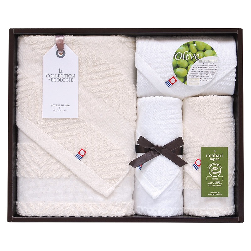 セット内容/バスタオル(エコマーク認定)(60×120cm)・フェイスタオル(エコマーク認定)・フェイスタオル(オリーブスクラブ) (各33×75cm) ・ハンドタオル(オリーブクラブ)(33×35cm) ×各1