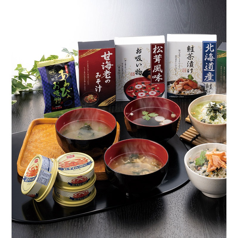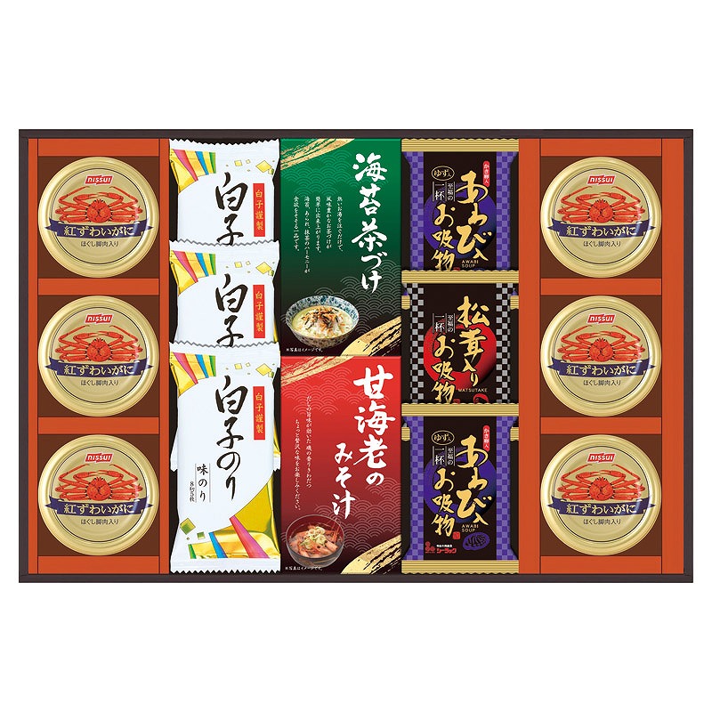 セット内容/紅ずわいがにほぐし身(55g)×6、白子のり (8切5枚)×3、あわび入お吸い物(4g)×2、甘海老みそ汁(7.5g×2袋)・丸美屋のり茶漬け(6g×4袋)・松茸入りお吸い物 (4.2g)×各1