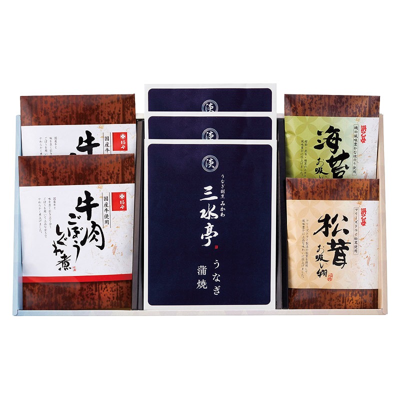 セット内容/三水亭 三河一色産うなぎの蒲焼(半身)×3、柿安 牛肉ごぼうしぐれ煮(50g)×2、浜乙女 海苔お吸物(3.6g×2p)・浜乙女 松茸お吸物(3.4g×2p)×各1