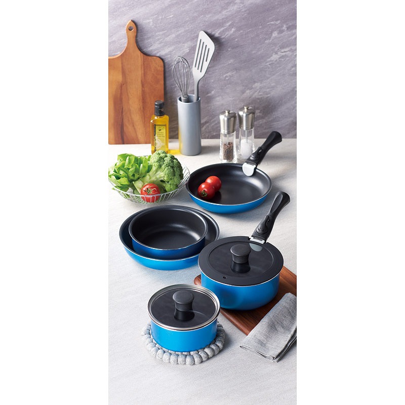 ライトブルーのボディが爽やかなIH対応の鍋セットです。ハンドル着脱式でキッチンスペースにスッキリ収納。本体はオーブン調理もでき、アツアツの料理をそのまま食卓に!内面はフッ素樹脂加工で焦げ付きにくくお手入れ簡単。手軽に使えるフライパンと鍋のセットです。ガス火・IH電磁調理器100V・200V対応。