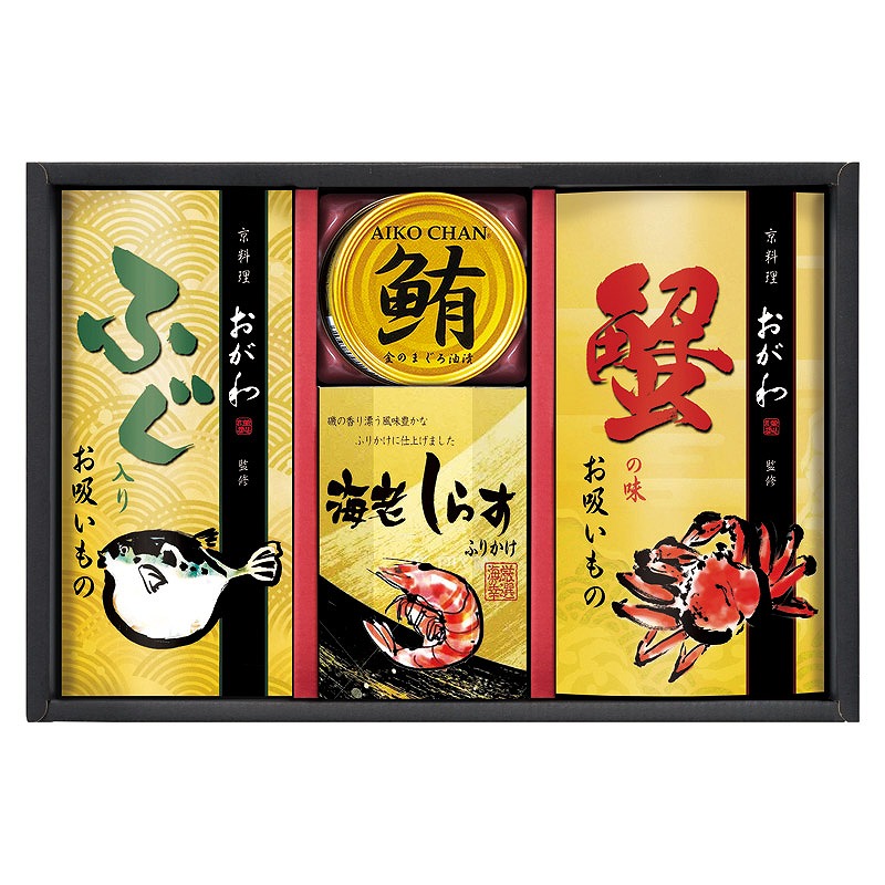 蟹の味お吸いもの(3.8g)・ふぐ入りお吸いもの(3.2g)・ 海老しらすふりかけ(3g)×各3、鮪油漬フレーク(70g)×1