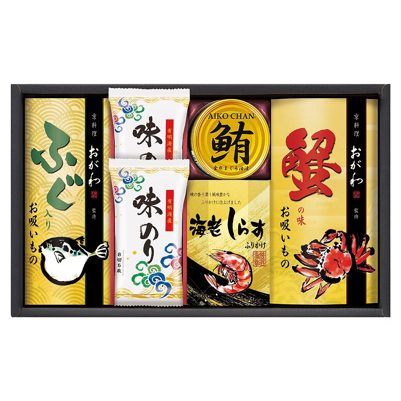 蟹の味お吸いもの(3.8g)・ふぐ入りお吸いもの(3.2g)・海老しらすふりかけ(3g)×各3、有明海産味のり(8切5枚)×2、鮪油漬フレーク(70g) ×1