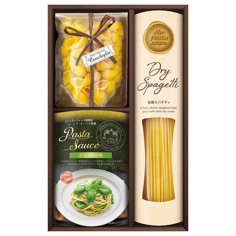 スパゲティ(130g)・ル・トア・ド・パリ監修あえるパスタソース(ジェノベーゼ)(100g)・マカロニ(コンキリエ)(70g)×各1
