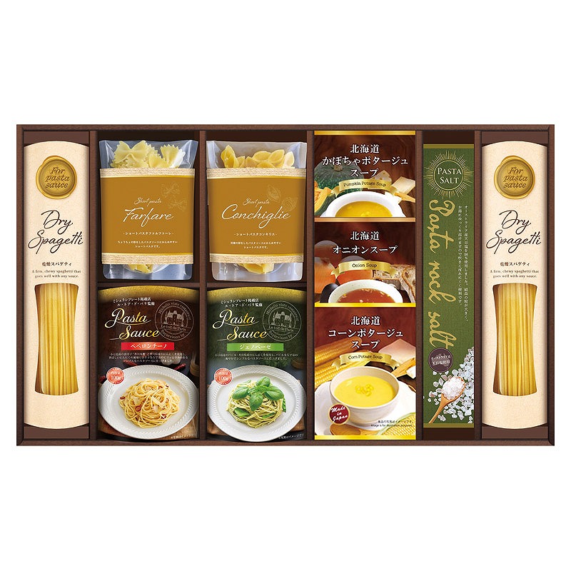 スパゲティ(130g)×2、マカロニ(コンキリエ(70g)・ファルファーレ(60g)・ル・トア・ド・パリ監修あえるパスタソース(ジェノベーゼ・ペペロンチーノ(各100g))・パスタソルト(100g)・北海道スープ(コーンポタージュ・かぼちゃポタージュ(各16.5g)・オニオン(7g))×各1