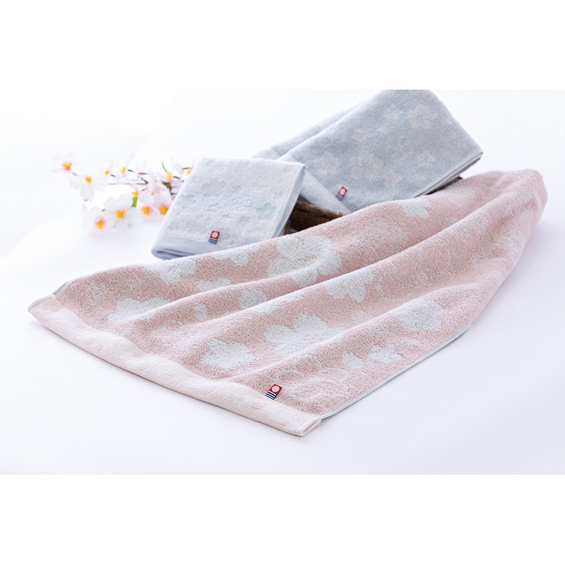 ふわりと舞うサクラを一枚のタオルに閉じ込めました。やわらかなタオルの中に舞う桜柄のタオルです。伝統の技術で織り上げられた今治産のタオルは、使いはじめから吸水性が良く、ふんわりとした風合いが長続きします。