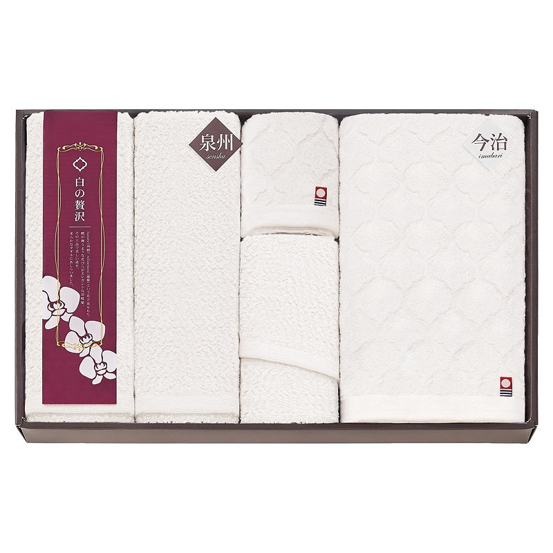 泉州スリムバスタオル(34×110cm)×2、今治バスタオル(60×110cm)・泉州スリムフェイスタオル(29×80cm)・今治ハンドタオル(33×33cm)×各1