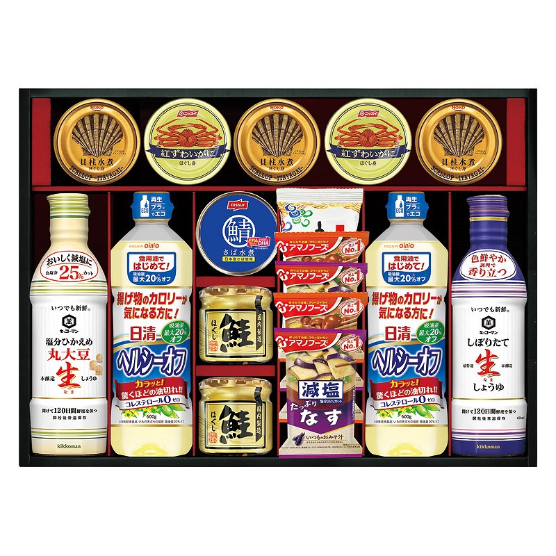 宝幸貝柱水煮ほぐし身(65g)×3、日清ヘルシーオフ(600g)・ニッスイ紅ずわいがにほぐし身(55g)・鮭ほぐし(50g)・アマノフーズ減塩いつものおみそ汁なす(9g)・アマノフーズ減塩いつものおみそ汁なめこ(8g)×各2、キッコーマン(塩分ひかえめ丸大豆生しょうゆ・しぼりたて生しょうゆ)(各450ml)・ニッスイさば水煮(150g)・有明海産味のり(8切5枚)×各1