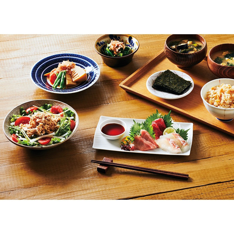 大森屋味付のり(8切5枚)×2、天然醸造?油(200ml)・アマノフーズいつものおみそ汁(なす・ほうれん草)・鮭めんたいこふりかけ(4g×3)・鮪油漬けフレーク(70g)×各1
