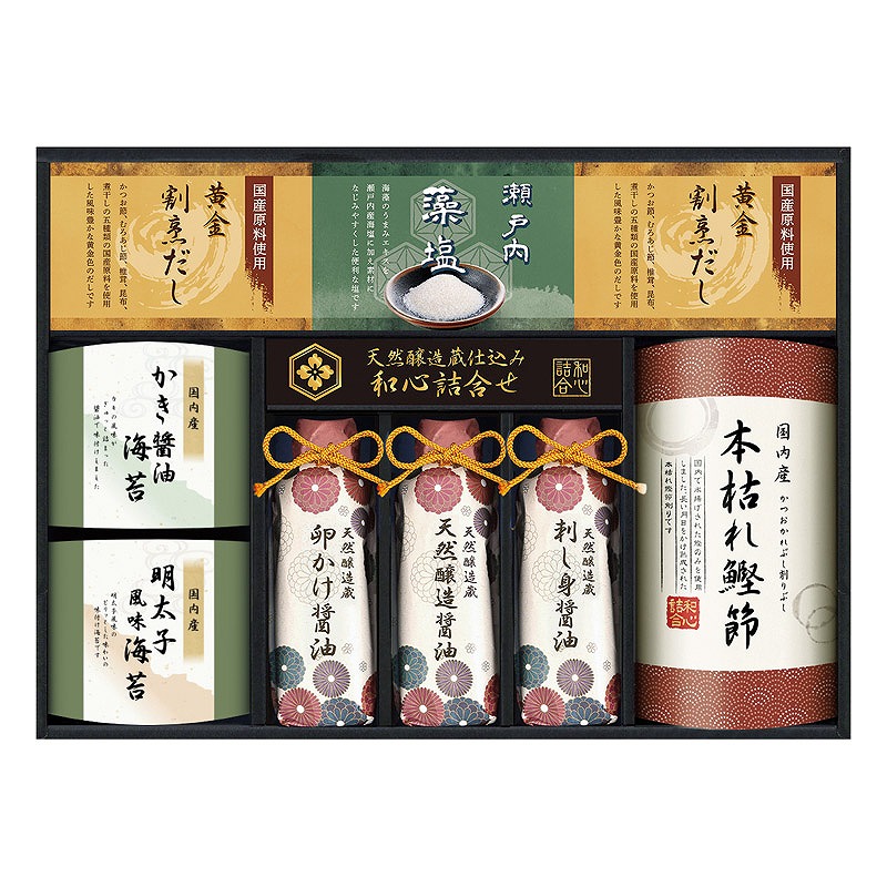 黄金割烹だしパック(8g)×4、本枯れ鰹節(2g)×3、牡蠣醤油海苔・明太子風味海苔(各8切6枚)・天然醸造蔵仕込み卵かけ醤油・天然醸造蔵仕込み刺し身醤油・天然醸造蔵仕込み天然醸造醤油(各200ml)・瀬戸内藻塩(50g)×各1