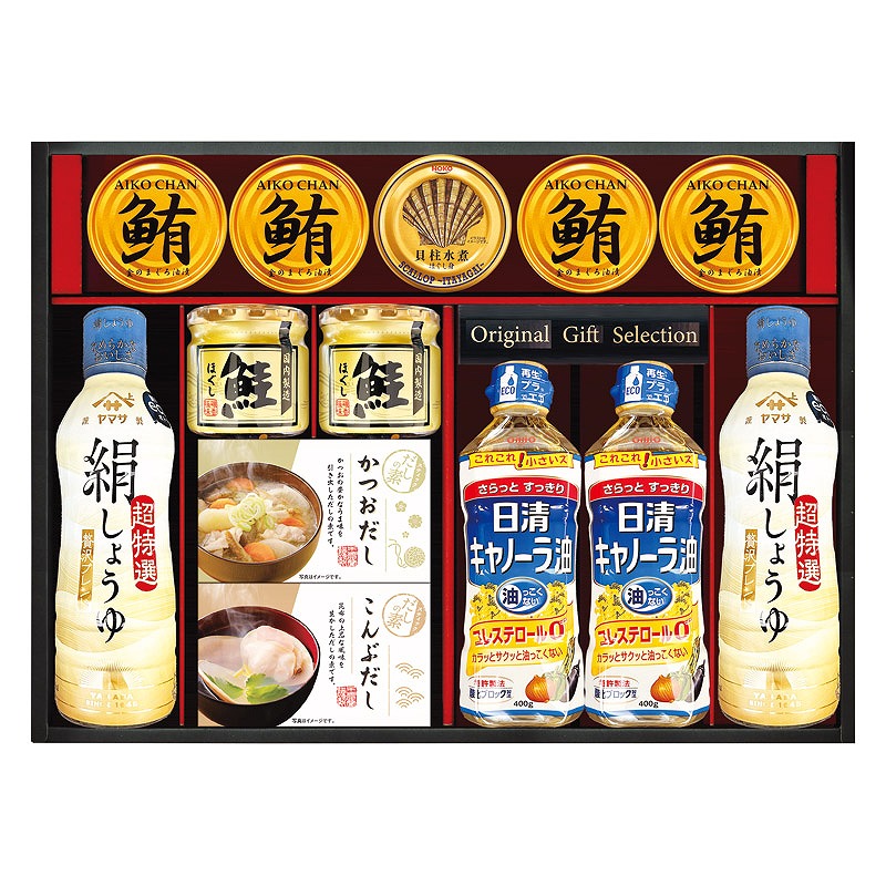ヤマサの絹しょうゆはうまみをしっかり引き出し、4つの麹(こうじ)が織りなす絶妙ブレンド。「生(なま)しょうゆ」のやわらかさと重ね仕込み製法の「火入れしょうゆ」のコクのある味を合わせ持つ、絶妙なバランスのブレンドしょうゆ、国産のかつお節の豊かなうま味を引き出したかつおだしに、国産昆布の上品な風味を生かしたこんぶだしなど、毎日の食卓へお届けする調味料バラエティギフトです