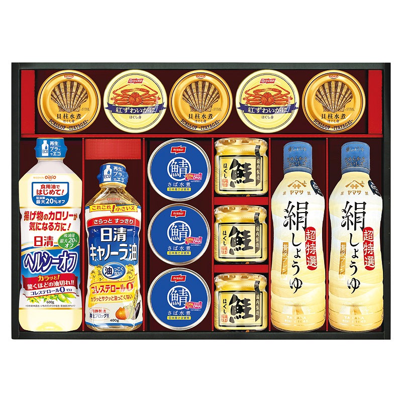 ニッスイさば水煮1(50g)・宝幸貝柱水煮ほぐし身(65g)(固形量35g)・鮭ほぐし(50g)×各3、ヤマサ絹しょうゆ(450ml)・ニッスイ紅ずわいがにほぐし身(55g)×各2、日清キャノーラ油(400g)・日清ヘルシーオフ(600g)×各1