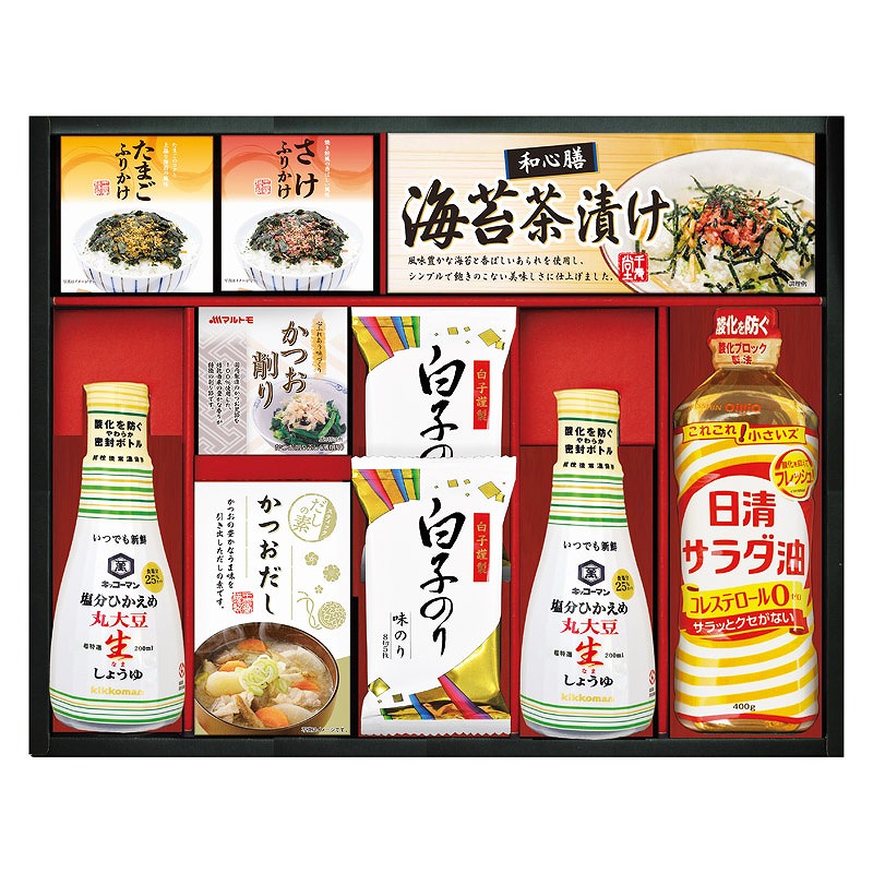 キッコーマン塩分ひかえめ丸大豆生しょうゆ(200ml)・白子のり味のり(8切5枚)×各2、日清サラダ油(400g)・海苔茶漬け(6g×5)・かね七かつおだし(4g×5)・丸美屋(たまごふりかけ・さけふりかけ)(各2.5g×3)・マルトモかつおパック(0.7g×3)×各1