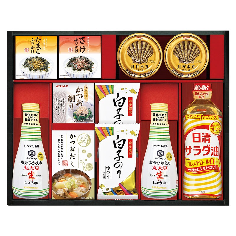 キッコーマン塩分ひかえめ丸大豆生しょうゆ(200ml)・宝幸貝柱水煮ほぐし身(65g)・白子のり味のり(8切5枚)×各2、日清サラダ油(400g)・かね七かつおだし(4g×5)・丸美屋(たまごふりかけ・さけふりかけ)(各2.5g×3)・マルトモかつおパック(0.7g×3)×各1