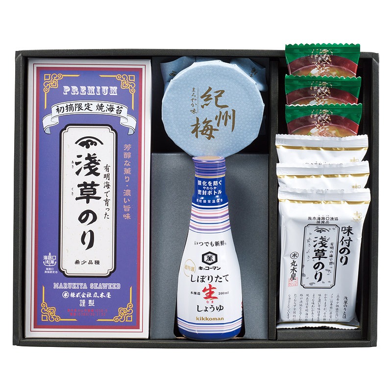 浅草味付のり(8切8枚×1袋)・マルトモフリーズドライ味噌汁ほうれん草(7.5g)×各3、浅草焼のり(半切5枚×2袋)・キッコーマンしぼりたて生しょうゆ(200ml)・紀州南高梅(100g)×各1