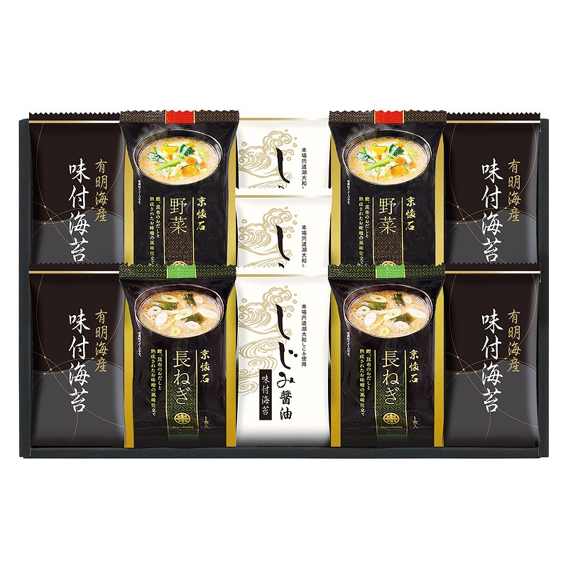 有明海産味付海苔(8切8枚)×4、しじみ醤油味付海苔(8切8枚)×3、マルコメ京懐石おみそ汁(野菜(17.4g)・長ねぎ(15.7g))×各2