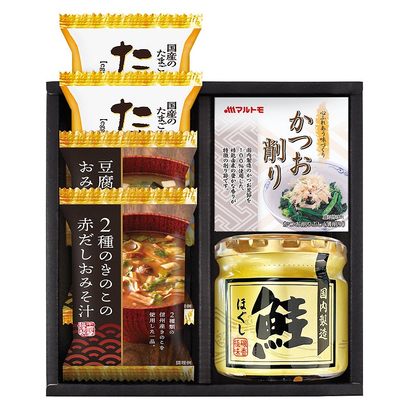 たまごスープ(6.4g)×2、とうふと油揚げのおみそ汁・2種のきのこの赤だしおみそ汁・マルトモかつおパック(0.7g×3)・鮭ほぐし(50g)×各1