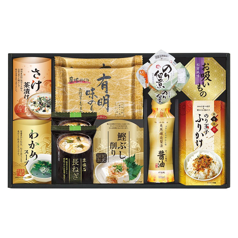 白子有明味のり(8切8枚)・マルコメ京懐石長ねぎのおみそ汁(15.7g)×各2、さけ茶漬け(4.7g×2)・わかめスープ(5.3g×2)・鰹節削り(2g×2)・島の香のり佃煮(80g)・永谷園お吸いもの松茸風味(2.3g×2)・のり玉子ふりかけ(4.5g×2)・伊賀越天然醸造しょうゆ(200ml)×各1