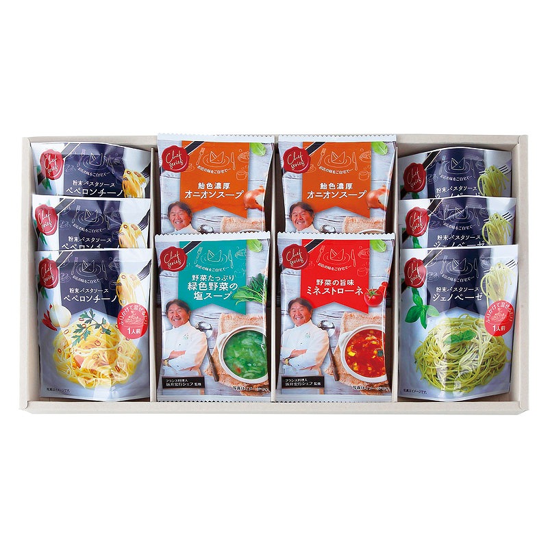 ジェノベーゼ粉末パスタソース・ペペロンチーノ粉末パスタソース×各3、オニオンスープ×2、ミネストローネ・緑色野菜の塩スープ×各1