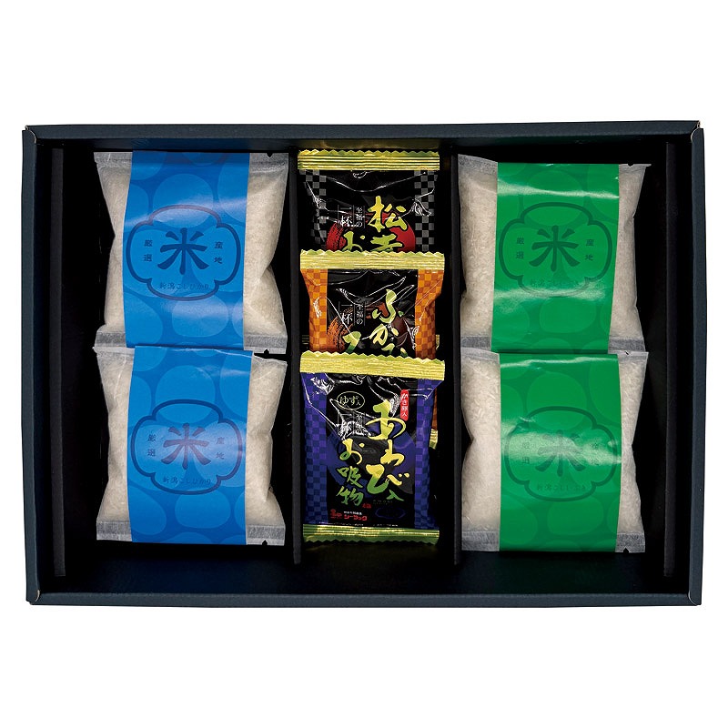 新潟県産コシヒカリ・新潟県産こしいぶき(各150g)×各2、ふかひれスープ(5.5g)・松茸のお吸物(4.2g)・あわび入お吸物(4g)×各1