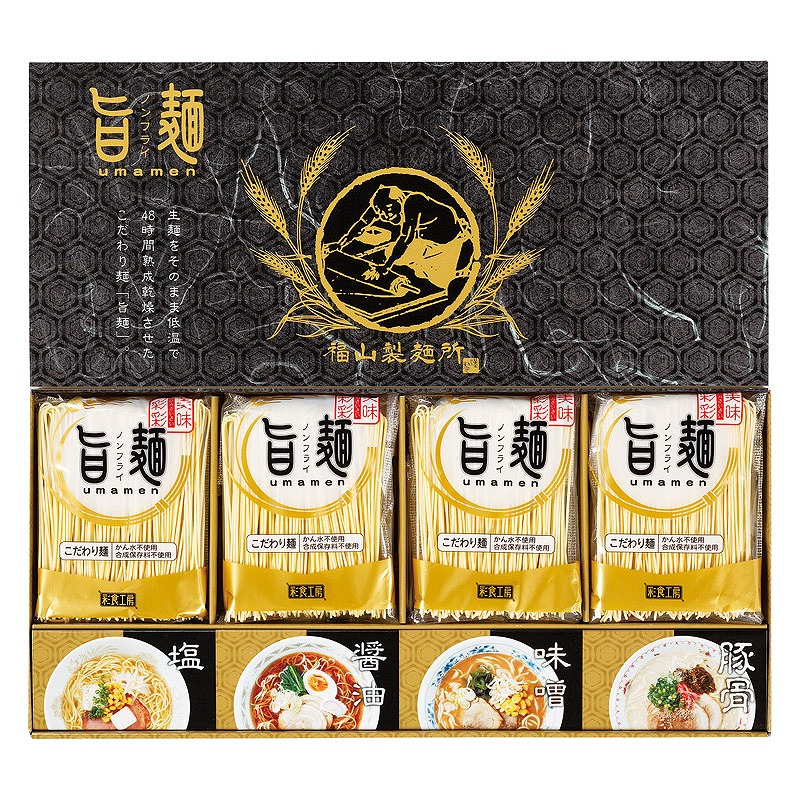 かん水を使用していない生麺を48時間熟成乾燥させ、うま味を凝縮させたノンフライの「旨麺」。まるで生麺のようなのど越しと食感が特徴のこだわり麺に各種スープをセットしました。