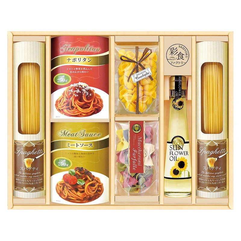 スパゲティ(130g)×2、マカロニ(コンキリエ)(70g)・自然色パスタ・ファルファーレ(卵・レッドチャード・オレガノ・ほうれん草・イカスミ)(各40g)・パスタソース(ミートソース2人前)・パスタソース(ナポリタン2人前)(各250g)・ひまわり油(110g)×各1