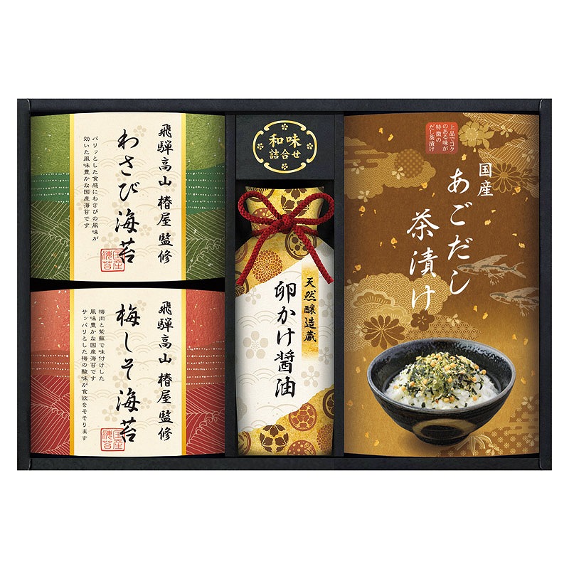 国産あごだし茶漬け(5g)×3、飛騨高山椿屋監修わさび海苔・飛騨高山椿屋監修梅しそ海苔(各8切6枚)・天然醸造蔵仕込み卵かけ醤油(200ml)×各1