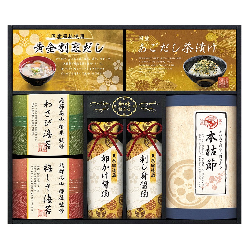 本枯れ鰹節(2g)×4、黄金割烹だしパック(8g)・国産あごだし茶漬け(5g)×各2、飛騨高山椿屋監修わさび海苔・飛騨高山椿屋監修梅しそ海苔(各8切6枚)・天然醸造蔵仕込み卵かけ醤油(200ml)・天然醸造蔵仕込み刺し身醤油(200ml)×各1