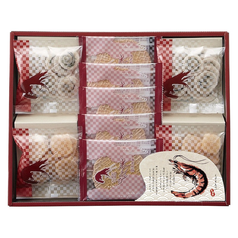 赤えびせんべい(1枚)×5、えびせん(うず巻・えび松風)(各10g)×各2