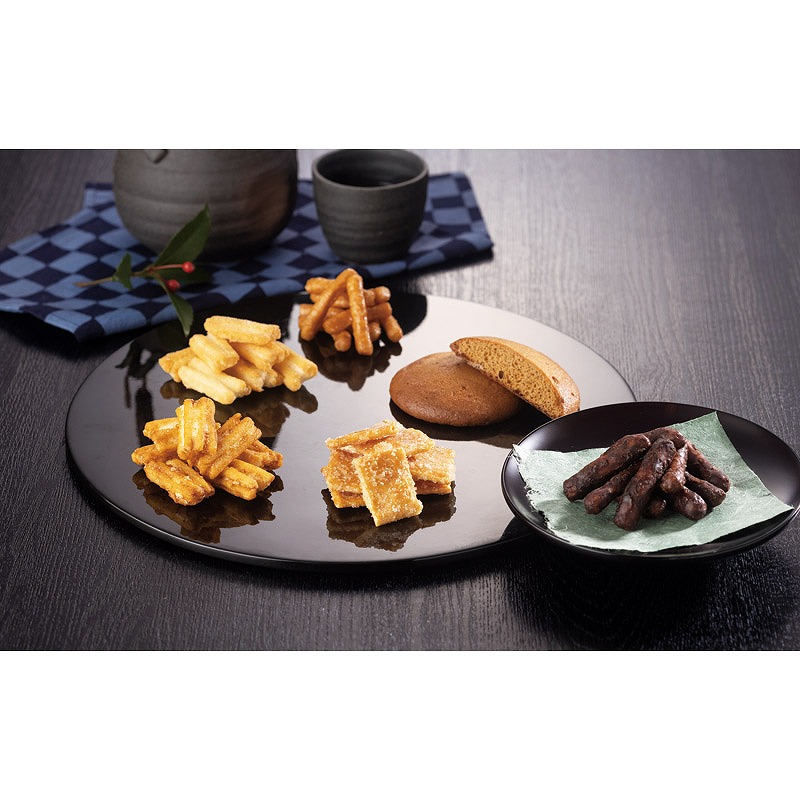 銘菓丸ぼうろに、粗く砕いた黒砂糖を練り込んだ黒糖丸ぼうろと国産玄米から作られた米油100%で揚げたさつまいもかりんとう、黒糖かりんとう。国産のもち米を使用し、米油とごま油をブレンドした油で揚げサクッとした食感の揚げ餅(醤油)と揚げ餅(塩)をセットした和菓子詰合せです。