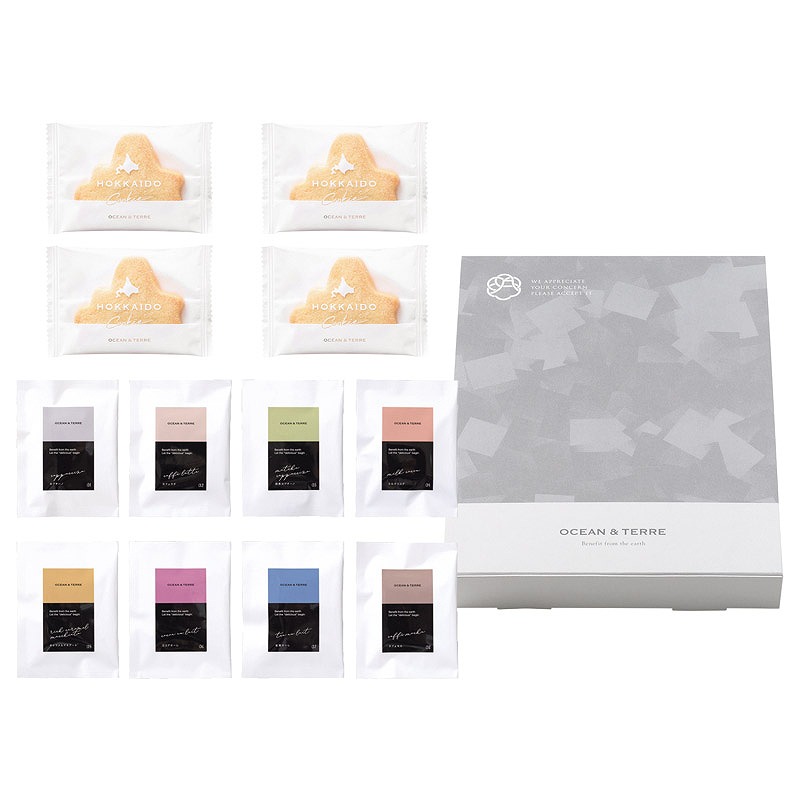 クッキー×4、カプチーノ・カフェラテ・抹茶カプチーノ・ミルクココア・キャラメルマキアート・ココアオーレ・紅茶オーレ・カフェモカ×各1