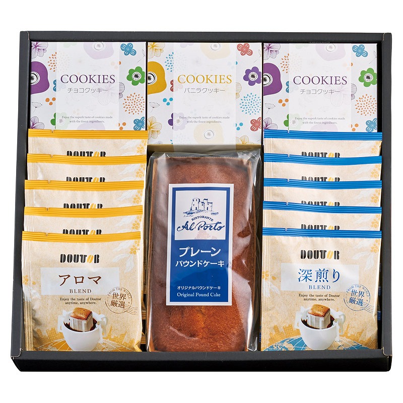 ドトールドリップコーヒー(深煎りブレンド・アロマブレンド)(各7g)×各5、クッキー(チョコ×2)(30g)×2、クッキー(バニラ)(30g)・プレーンパウンドケーキ×各1