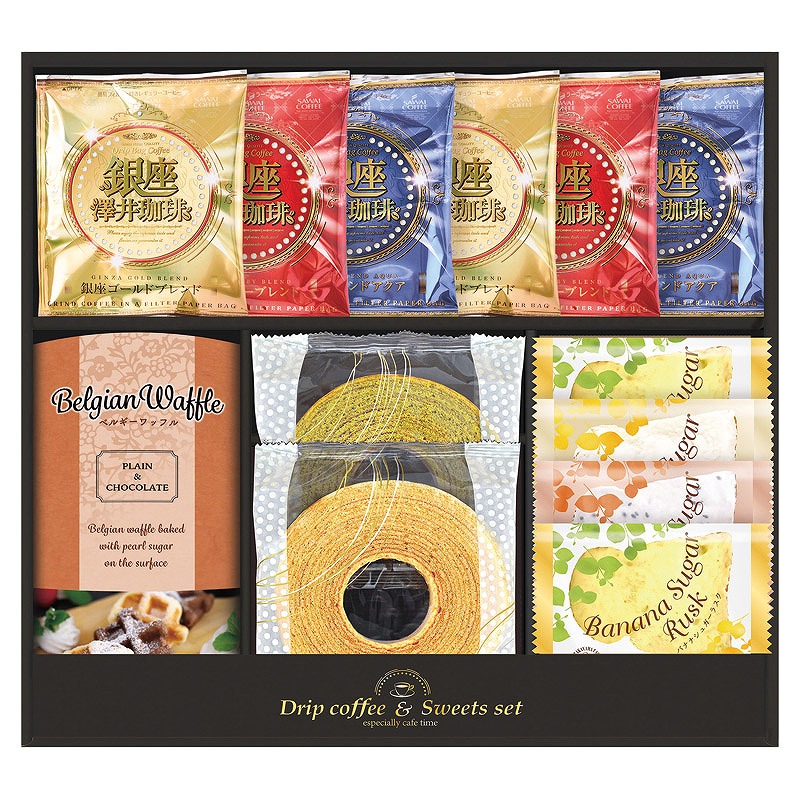 銀座澤井珈琲ドリップコーヒー(ゴールドブレンド・ルビーブレンド・ブレンドアクア)・飛騨高山ファクトリーラスク(バナナ)・ベルギーワッフル(プレーン)×各2、ミルクバウムクーヘン・宇治抹茶バウムクーヘン・飛騨高山ファクトリーラスク(シュガー・セサミ)・ベルギーワッフル(ショコラ)×各1