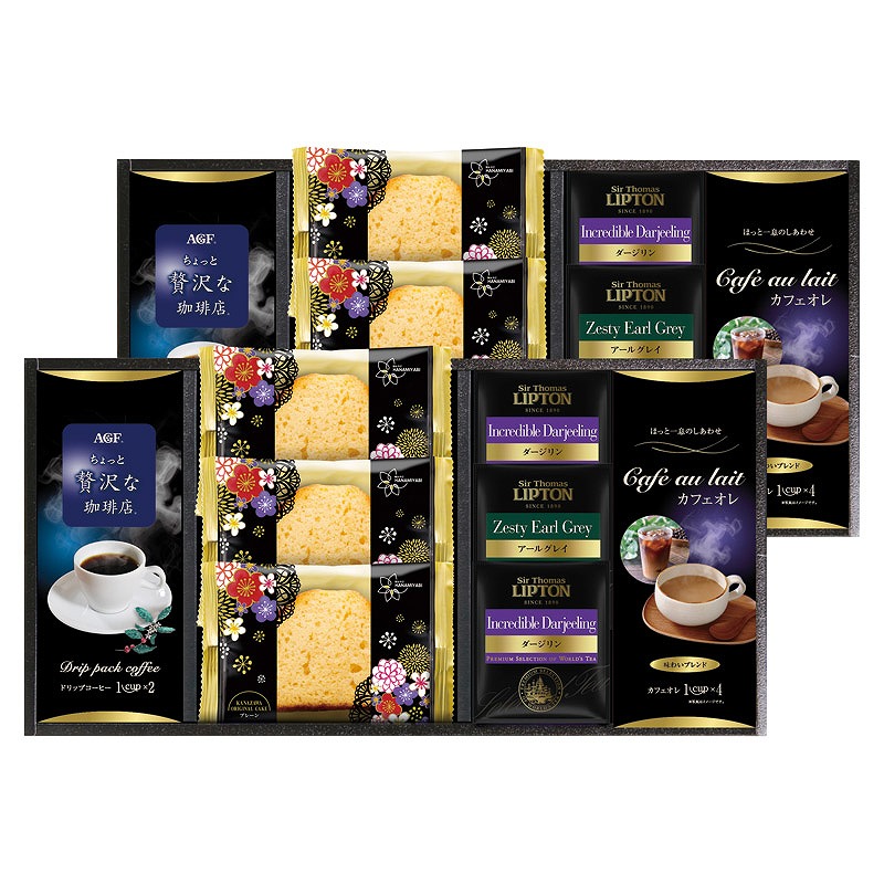 金澤兼六製菓オリジナルケーキ(プレーン)×6、サー・トーマス・リプトンダージリンティーバッグ(2.2g)×4、・サー・トーマス・リプトン アールグレイティーバッグ(2.1g)・AGF ちょっと贅沢な珈琲店スペシャルブレンド(7g×2袋)・カフェオレ(12g×4袋)×各2