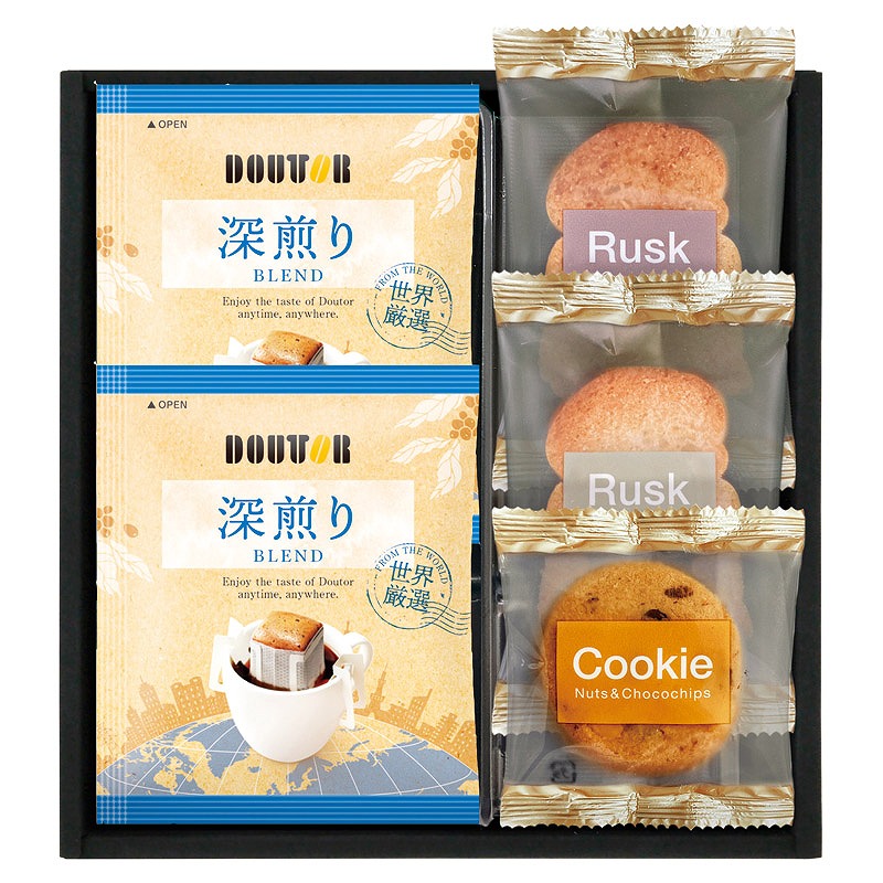 ドトールドリップコーヒー(7g)×2、ラスク(シュガー・ココナッツ)・ナッツとチョコのざっくりクッキー×各1
