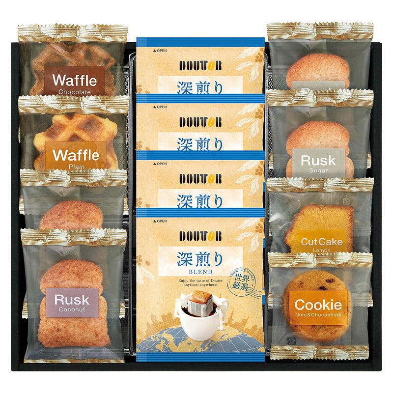 ドトールドリップコーヒー(7g)×4、ラスク(シュガー・ココナッツ)×各2、ワッフル(プレーン・チョコ)・ナッツとチョコのざっくりクッキー・レモンケーキ×各1
