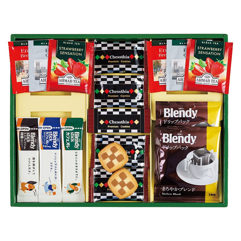 チェスティアクッキー×4、AGFブレンディドリップコーヒー(7g)・紅茶(アールグレイ・ブレックファースト・ストロベリー)(各2g)×各2、AGFブレンディスティックコーヒー(カフェオレ(8.2g)・エスプレッソオレ(5.8g)・カフェオレカロリーハーフ(5.4g))×各1