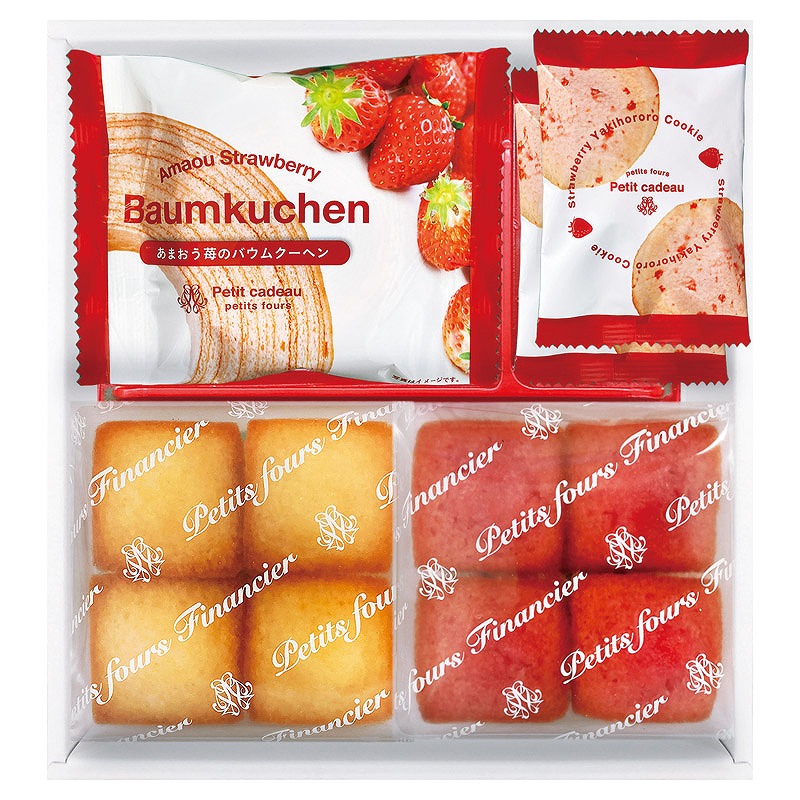 焼きほろろクッキー(イチゴ)×2、あまおう苺バウムクーヘン・プチフィナンシェ(あまおう苺・プレーン)(各4個入)×各1