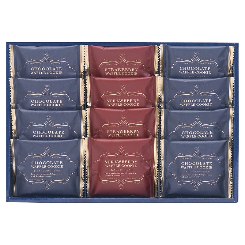 サクサク食感のワッフルクッキーにホワイトチョコクリームを詰めた風味豊かなショコラワッフルクッキーといちごチョコクリームを詰めたいちごワッフルクッキーの詰合せです。
