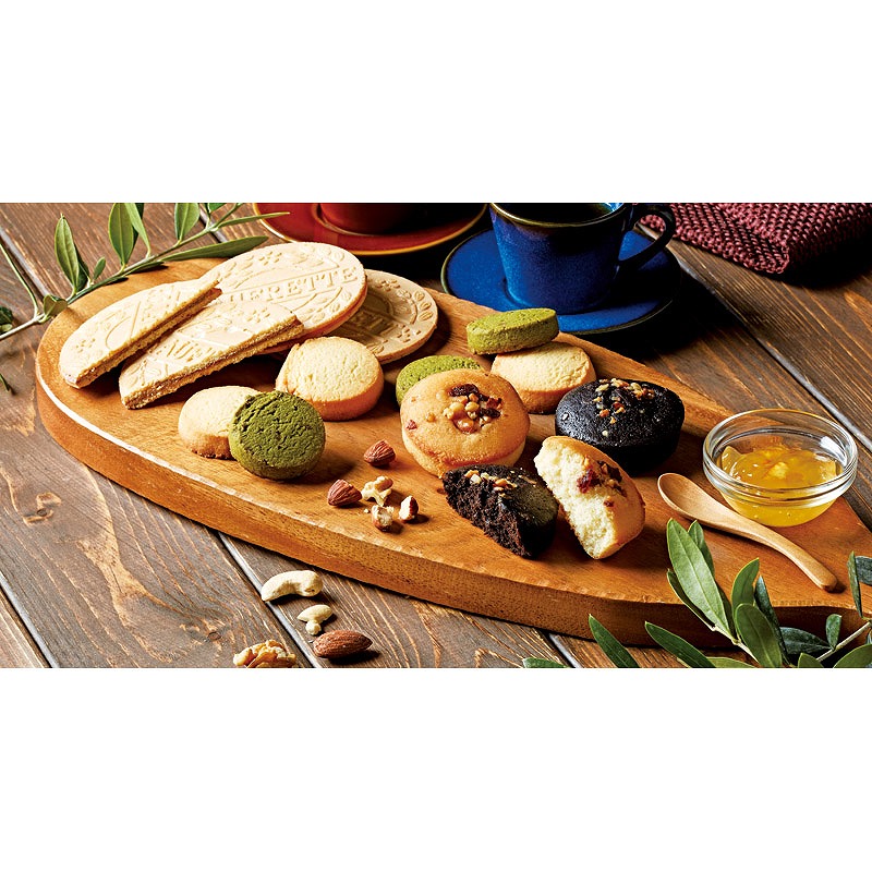 ココアパウダーを2種類配合したこだわりのチョコフィナンシェ、バニラビーンズソースを練り込みしっとりと焼き上げたバニラフィナンシェ、それぞれにくるみ、アーモンド、ドライクランベリーをトッピングした2種類のごろっとナッツフィナンシェ、3種のチーズ(クリームチーズパウダー、ゴーダチーズパウダー、ゴルゴンゾーラ合わせですチーズパウダー)を使用し、チーズ風味豊かなさっくりとしたチーズクッキーと、抹茶パウダーとフリーズドライの小豆を一緒に練り込んだ和テイストの厚焼きの抹茶クッキー、上品な味わいに仕上げたチョコゴーフレットの詰め