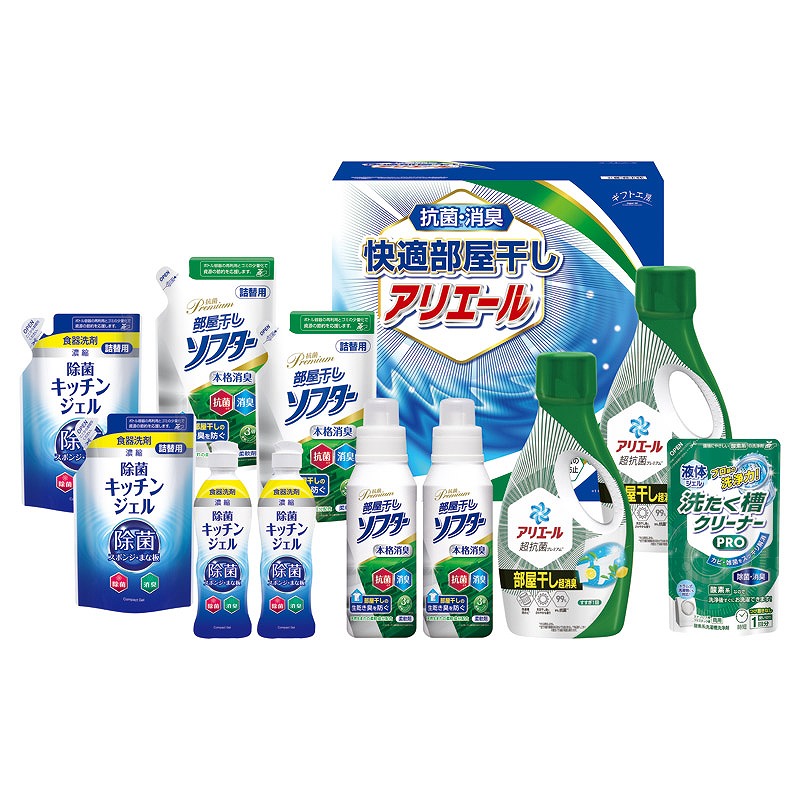 生乾き臭・カビ臭にWで効く部屋干し用のアリエールジェルと本格消臭の抗菌部屋干しソフター、食器洗剤除菌キッチンジェルが入ったクリーンギフトです。