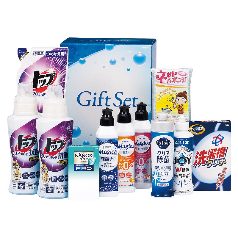 ライオントップクリアリキッド抗菌(本体)(450g)×2、ライオントップクリアリキッド抗菌(つめかえ用)(350g)・P&G除菌ジョイコンパクト(170ml)・ライオンCHARMY Magica除菌+・ライオンCHARMY Magica酵素+オレンジの香り・ライオンCHARMY Magica酵素+フレッシュピーチの香り・花王キュキュット(クリア除菌)(各220ml)・ライオンNANOX one PRO(10g×2袋)・洗濯槽クリーナー5錠箱入・ネットスポンジ1P×各1