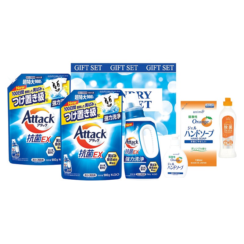 アタック抗菌EX超特大(詰替)(900g)×2、アタック抗菌EX(750g)・台所洗剤除菌フレッシュ(240g)・弱酸性ジェルハンドソープ(200ml)・弱酸性ジェルハンドソープ(詰替)(190ml)×各1