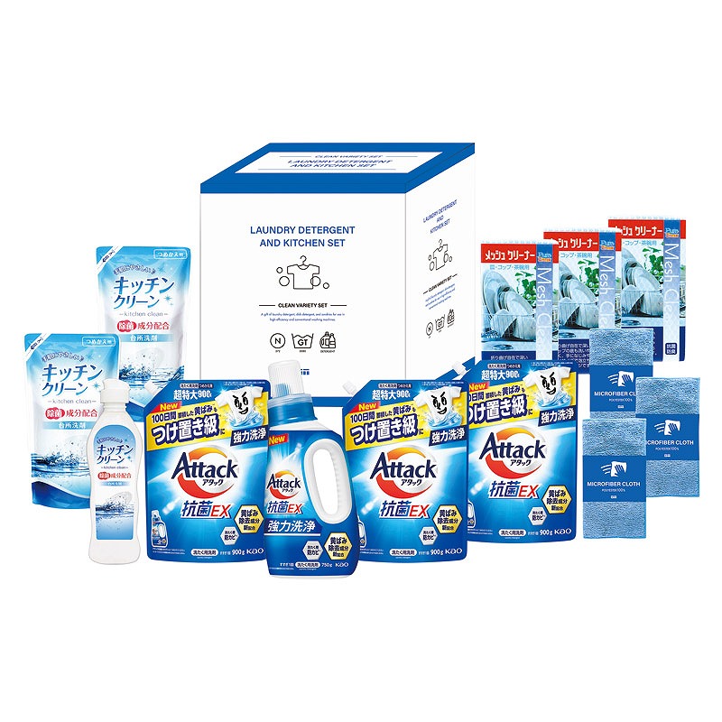 花王アタック抗菌EX詰替用(900g)・メッシュクリーナー(中国)・マイクロファイバークロス(中国)(20×20cm)×各3、キッチンクリーン詰替(200ml)×2、花王アタック抗菌EX本体(750g)・キッチンクリーン(250ml)×各1
