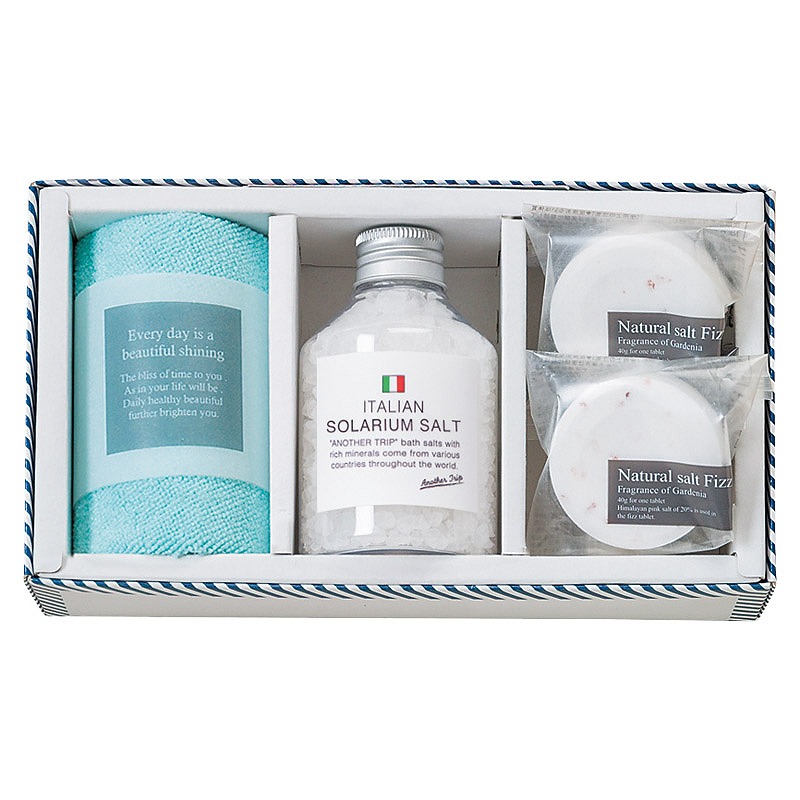 ソルトフィズ(40g)×2、イタリアンバスソルト(イタリア)(180g)・マイクロファイバークロス(中国)(25×25cm)×各1