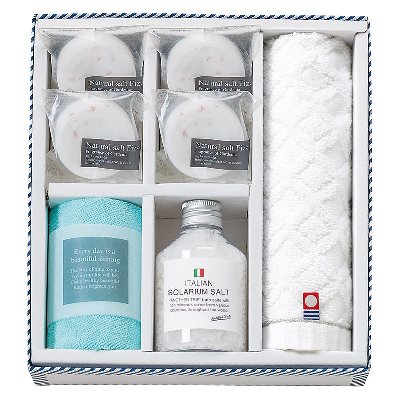 ソルトフィズ(40g)×4、イタリアンバスソルト(イタリア)(180g)・今治ウォッシュタオル(28×30cm)・マイクロファイバークロス(中国)(25×25cm)×各1