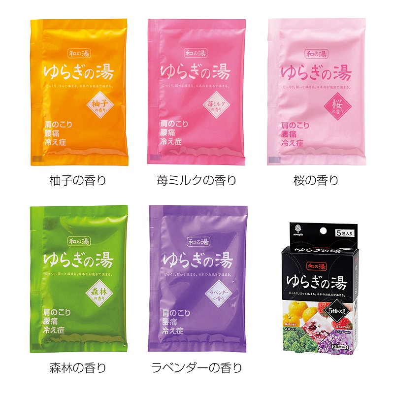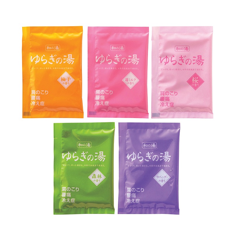 セット内容:入浴剤(柚子の香り・苺ミルクの香り・桜の香り・森林の香り・ラベンダーの香り)25g×各1
